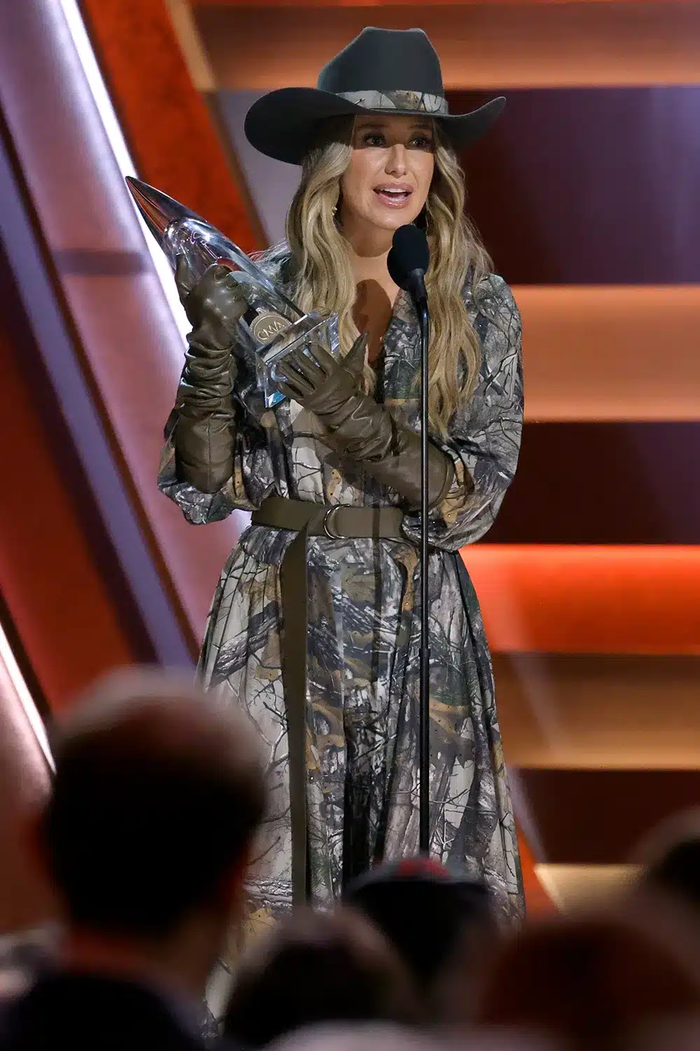 But it was her final look — worn to accept the coveted Entertainer of the Year award — that delivered the ultimate statement. Wilson closed the night in a long-sleeve camo-print jumpsuit cinched with an olive belt and accented with matching gloves. The black cowboy hat she wore featured a camo-print band, tying the entire look together in rugged, country-perfect glamour.